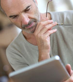 Średnim wieku facet z modnych okularów czytania gazety