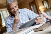 Zdjęcie "Średnim wieku facet z modnych okularów czytania gazety" może być wykorzystywane do celów osobistych i komercyjnych zgodnie z warunkami zakupionej licencji Royalty-free. Obraz jest dostępny do pobrania w jakości wysokiej rozdzielczości do 5760x3840.