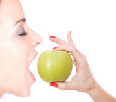 599 kobiet gryzący w zbliżenie świeży jabłko na białym tle