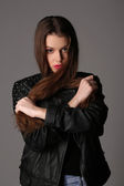 piękna młoda kobieta w skórzanej kurtce na szarym tle, glamour