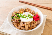Zdjęcie "miska ryżu wieprzowego z jajkiem (Donburi) - japoński styl jedzenia" może być wykorzystywane do celów osobistych i komercyjnych zgodnie z warunkami zakupionej licencji Royalty-free. Obraz jest dostępny do pobrania w jakości wysokiej rozdzielczości do 5760x3840.