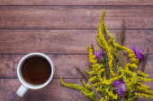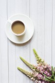Martwa natura z filiżanką kawy i Wilcza kwiaty pączek na lekki drewniany stół miejsce