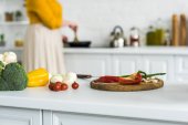 niewyraźne, uśmiechnięta młoda kobieta rozmawia przez telefon z warzywami i kieliszek szampana na pierwszym planie w domu