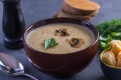 Zupa krem grzybowa w brązowy talerz na stole. Ciemne tło. Zdrowe jesienią tradycyjne danie wegetariańskie