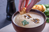 Zdjęcie "Zupa krem grzybowa w brązowy talerz na stole. Ciemne tło. Zdrowe jesienią tradycyjne danie wegetariańskie" może być wykorzystywane do celów osobistych i komercyjnych zgodnie z warunkami zakupionej licencji Royalty-free. Obraz jest dostępny do pobrania w jakości wysokiej rozdzielczości do 5760x3840.