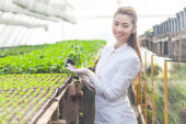 Ładna młoda kobieta agronomist gospodarstwa sadzonki w doniczce w szklarni z mikroskopem w tle. Koncepcja ochrony roślin i poprawy wydajności
