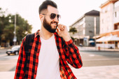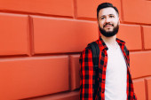 Zdjęcie "Portret piękne stylowe faceta, hipster w okularach, ubrany w szary t-shirt pusty, stojąc na tle czarna ściana." może być wykorzystywane do celów osobistych i komercyjnych zgodnie z warunkami zakupionej licencji Royalty-free. Obraz jest dostępny do pobrania w jakości wysokiej rozdzielczości do 5760x3840.