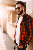 Portret piękne stylowe faceta, hipster w okularach, ubrany w szary t-shirt pusty, stojąc na tle czarna ściana.