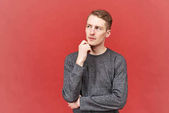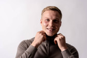 portret ładny facet młody na białym tle siedzi przy stole w różnych pozach z różnych emocji. On siedzi tuż przed kamerą i wygląda szczęśliwy