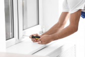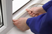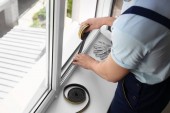 Pracownik budowlany, zakładanie uszczelniająca taśma piankowa okno w pomieszczeniu