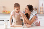 Matka i jej córka, wyrabiania ciasta przy stole w kuchni