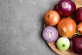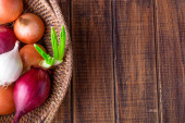 Maty wiklinowe z świeżej cebuli dojrzałe na drewnianym stole