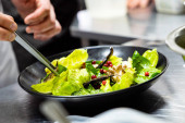 Szef kuchni przygotowuje Sałatka z warzywami i zdobi ten posiłek z ziołami