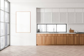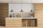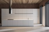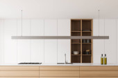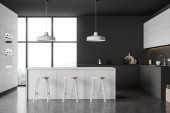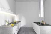 Blaty kuchenne biały stojący w aranżacji kuchni biała ściana, z betonową oraz rząd lamp. makiety 3D renderowania