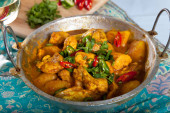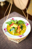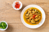Fried kości wieprzowe pikantne z żółtym curry wklej na danie jedzenie stylu tajskim