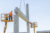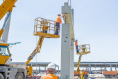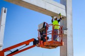 Pracownik jest pomoc dźwig do zarządzania betonowych belek dla ogromne budowy zespołu.
