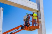 Pracownik jest pomoc dźwig do zarządzania betonowych belek dla ogromne budowy zespołu.