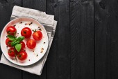 Tło żywności. Płaskim leżał świeżych pomidorów z bazylią, czosnek i seasalt na czarnym tle kamienia. Kwadratowych upraw, widok z góry.