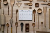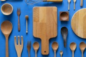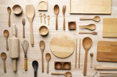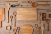 naczynia kuchenne do gotowania na drewnianym stole, koncepcja przygotowywania żywności