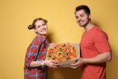 Atrakcyjna, Młoda para z pyszną pizzę na kolor tła
