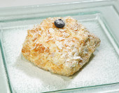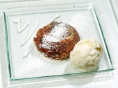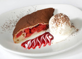 Deser - kawałek ciasta, herbatniki i krem, zbliżenie.