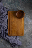 Widok z góry z drewniana deska do krojenia na szary płótno na czarnym tle drewnianych