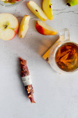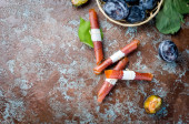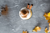 Czekolada mleczna koktajl lub zimno bitą Kawa z mlekiem i lodu posypane kakao na ciemny deseń, kopiować przestrzeń, widok z góry