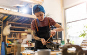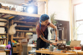 Zdjęcie "Czarnoziem Afro american kobieta pracuje w jej warsztat" może być wykorzystywane do celów osobistych i komercyjnych zgodnie z warunkami zakupionej licencji Royalty-free. Obraz jest dostępny do pobrania w jakości wysokiej rozdzielczości do 5760x3840.
