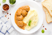 Klopsiki z ziemniakami, sosem pomidorowym, klasyczne, pyszne jedzenie