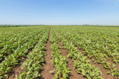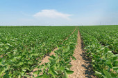 Zielone dojrzewające pole sojowe. Wiersze zielonej soi. Plantacja soi.