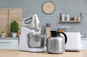 Zdjęcie "Urządzenia gospodarstwa domowego i kuchni na stole z niewyraźne tło" może być wykorzystywane do celów osobistych i komercyjnych zgodnie z warunkami zakupionej licencji Royalty-free. Obraz jest dostępny do pobrania w jakości wysokiej rozdzielczości do 5760x3840.