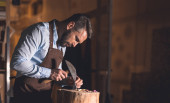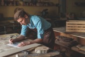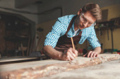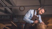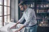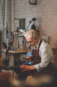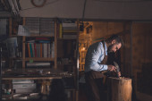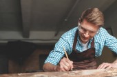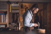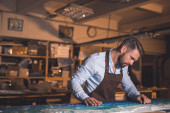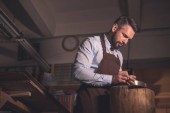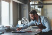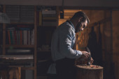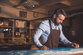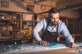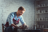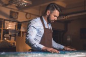 Zdjęcie "Młody człowiek w fartuch w pomieszczeniu pracy" może być wykorzystywane do celów osobistych i komercyjnych zgodnie z warunkami zakupionej licencji Royalty-free. Obraz jest dostępny do pobrania w jakości wysokiej rozdzielczości do 5760x3840.