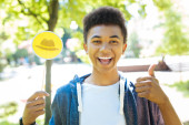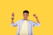 Miły człowiek szczęśliwy, skierowaną w górę z jego palec