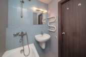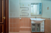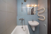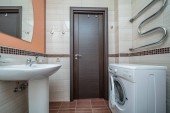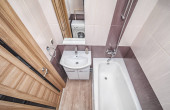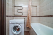 Łazienka mała beżowa płytka z kąpiel tube umywalka i pralka