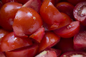 Pomidory makro, czerwone zdrowe warzywa plasterkowane na drewnianym biurku. Makro szczegół czerwonego świeżego pomidorów z ogrodu
