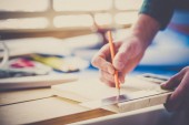 Zdjęcie "Zbliżenie człowiek pracy architekta Szkicowanie projekt budowlany na jego płaszczyzny projektu w miejscu prac budowlanych" może być wykorzystywane do celów osobistych i komercyjnych zgodnie z warunkami zakupionej licencji Royalty-free. Obraz jest dostępny do pobrania w jakości wysokiej rozdzielczości do 5760x3840.