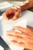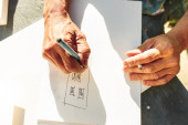 Zbliżenie człowiek pracy architekta Szkicowanie projekt budowlany na jego płaszczyzny projektu w miejscu prac budowlanych