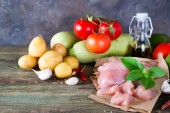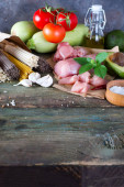kupa włoskiego spaghetti, surowy makaron soba i comen, surowe mięso z kurczaka, awokado z pomidorem na starym drewnianym tle, szelest leżał z miejsca na ksero. Pojęcie gotowania domowej roboty żywności