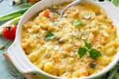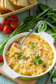 Zapiekanka z kruszonką z czerwona ryba, białego pieczywa i sera na drewnianym stole w kuchni. Prawidłowe odżywianie. Miejsce