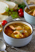 Warzyw i zupa rybna czerwony ze śmietaną i pietruszki na podłoże drewniane kuchnia.