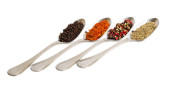 Zdjęcie "Inne przyprawy w łyżki żelaza na białym tle. Widok z góry suszonego rozmarynu, szafran, pieprz. " może być wykorzystywane do celów osobistych i komercyjnych zgodnie z warunkami zakupionej licencji Royalty-free. Obraz jest dostępny do pobrania w jakości wysokiej rozdzielczości do 5760x3840.