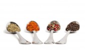 Inne przyprawy w łyżki żelaza na białym tle. Widok z góry suszonego rozmarynu, szafran, pieprz.
