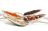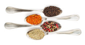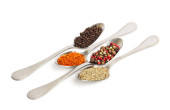 Inne przyprawy w łyżki żelaza na białym tle. Widok z góry suszonego rozmarynu, szafran, pieprz.