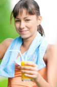 młoda kobieta pije sok pomarańczowy. odkryty