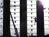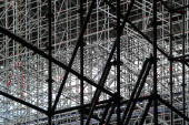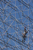 Tło, metalowa konstrukcja przenośna estrady z oświetlacze.