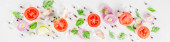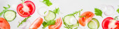 Twórczy tle, układ, pojęcie świeże zdrowej diety, sałatki, świeże warzywa surowe pomidory pietruszka cebuli ogórków zielonych, prosty wzór na tle transparent