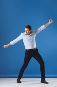 podekscytowany mężczyzna skoki i triumfuje na niebiesko