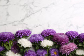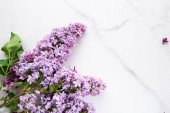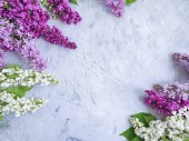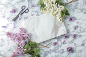 Piękny liliowy kwitnących i nożyczki na jasnym tle, widok z góry. Wiosenne kwiaty