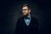 Portret superbohatera villain geniusz w czarnej koszulce z czerwonym krawatem.