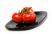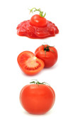 Plasterki pomidorów spaść na płycie kuchnia na białym tle